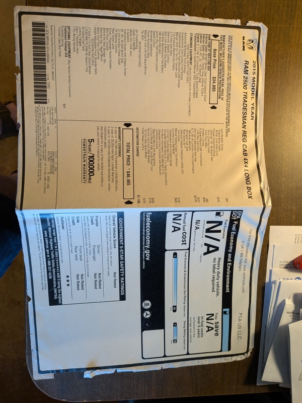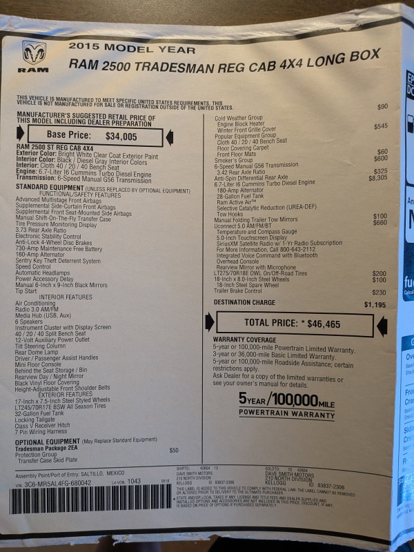 2015 Ram 2500 Tradesman Cummins 6.7L Diesel, 6-Speed Manual, 4x4, Regular Cab, Long Bed 19,169 Original Miles